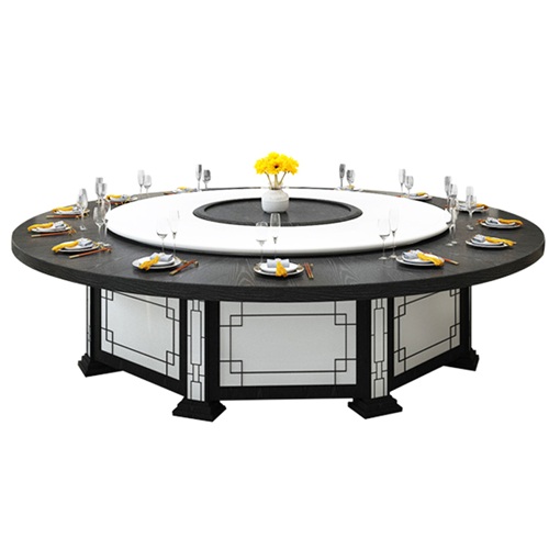 酒店新中式自動(dòng)旋轉(zhuǎn)15人20人大圓桌電動(dòng)餐桌采用的是經(jīng)典黑白顏色的搭配,以傳統(tǒng)的窗花花格作為設(shè)計(jì)元素,體現(xiàn)中國(guó)傳統(tǒng)文化的傳承,