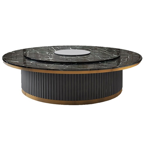 酒店包廂大理石豪華電動餐桌大圓桌,是由黑色大理石桌面鈦金包邊,底座也用了鈦金包邊,這樣