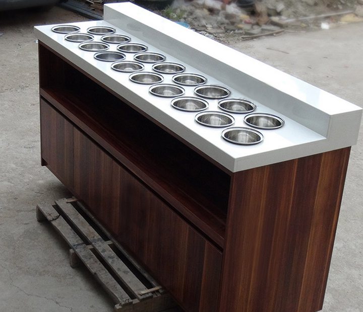 不同醬料臺有不同的特色,本廠家有實木醬料臺,大理石醬料臺,玻璃醬料臺等各式醬料臺。醬料臺可以根據(jù)您火鍋店的裝修環(huán)境做成不同的色調(diào),讓您的餐廳品味高雅,時尚,大氣。