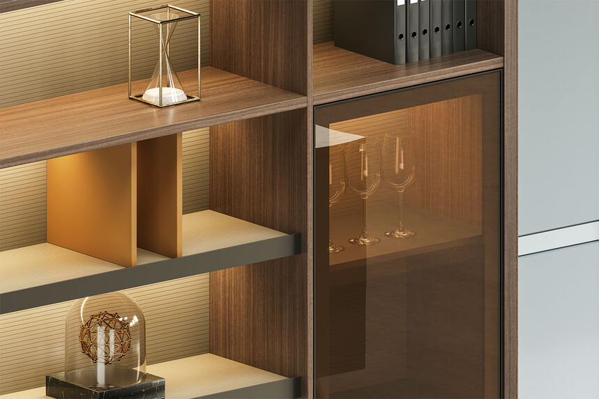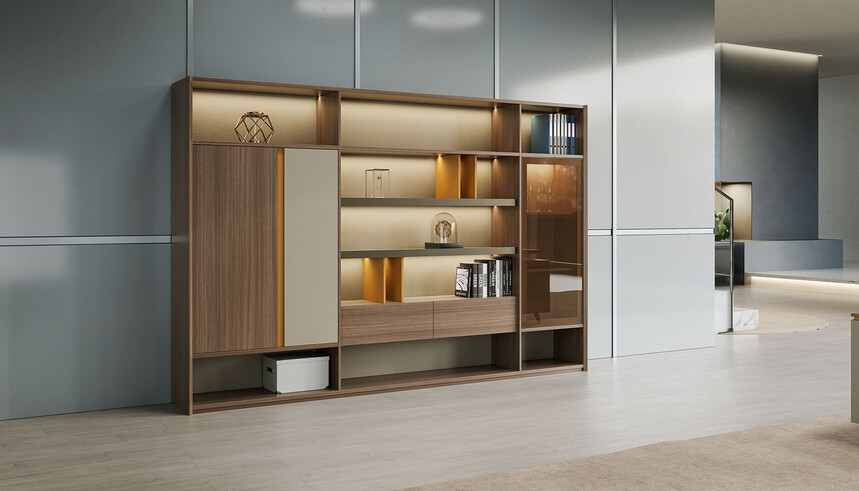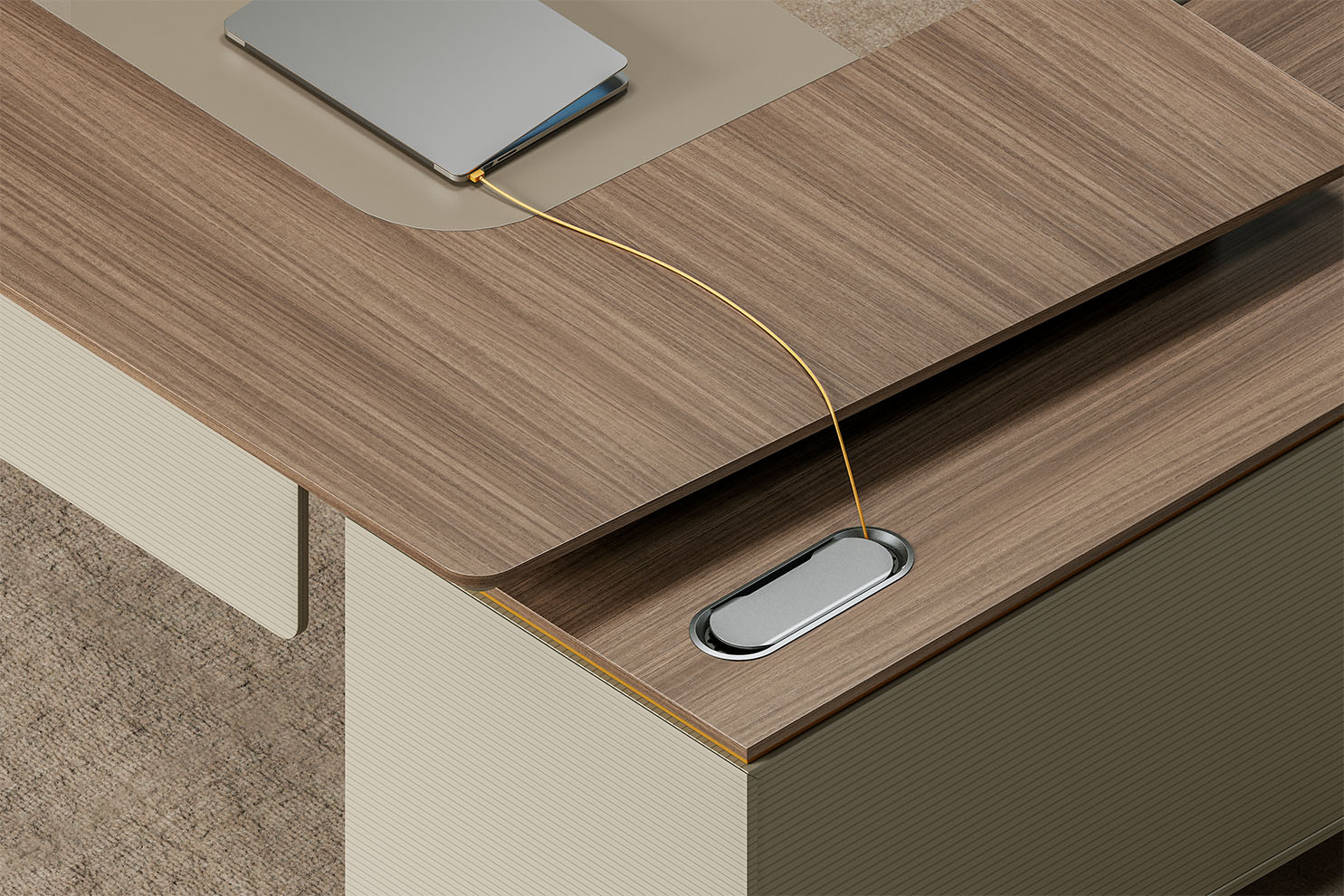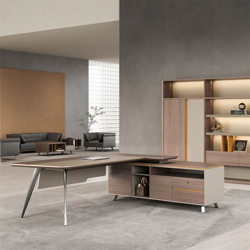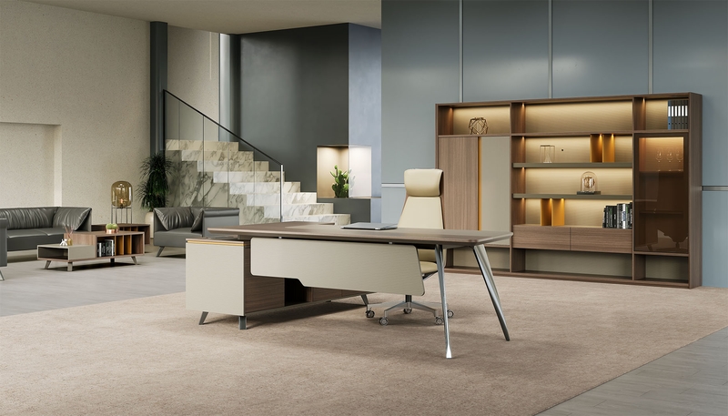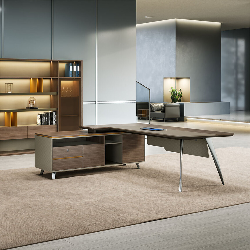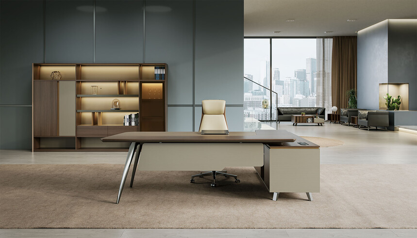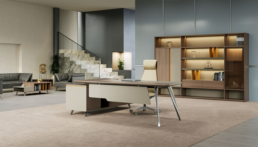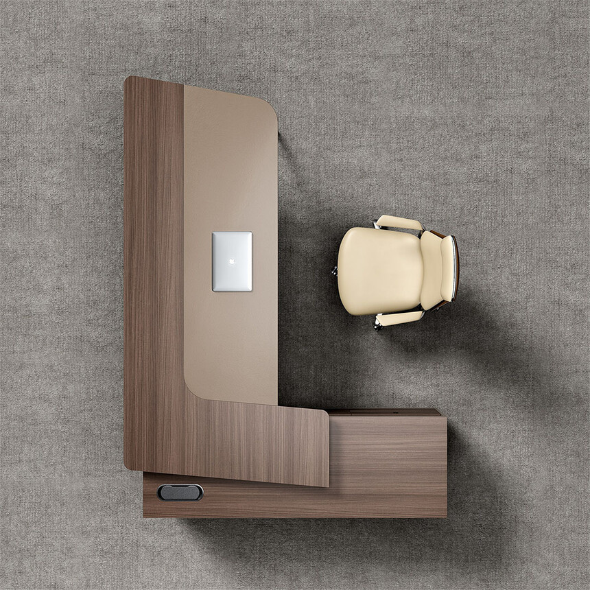 賓利系列產(chǎn)品外觀采用意式輕奢的設(shè)計風(fēng)格,主附臺面一體化,雙層面板,整體造型全方位的意式切割風(fēng)格,體現(xiàn)了產(chǎn)品造型的不對稱美,主附配置大小八字鋼腳讓整個產(chǎn)品既有質(zhì)感又有美感,加上產(chǎn)品搭配爵士胡桃與條紋蘆灰的配色,充分體現(xiàn)產(chǎn)品高品位的氣質(zhì),是現(xiàn)代都市辦公空間最佳選擇之一。