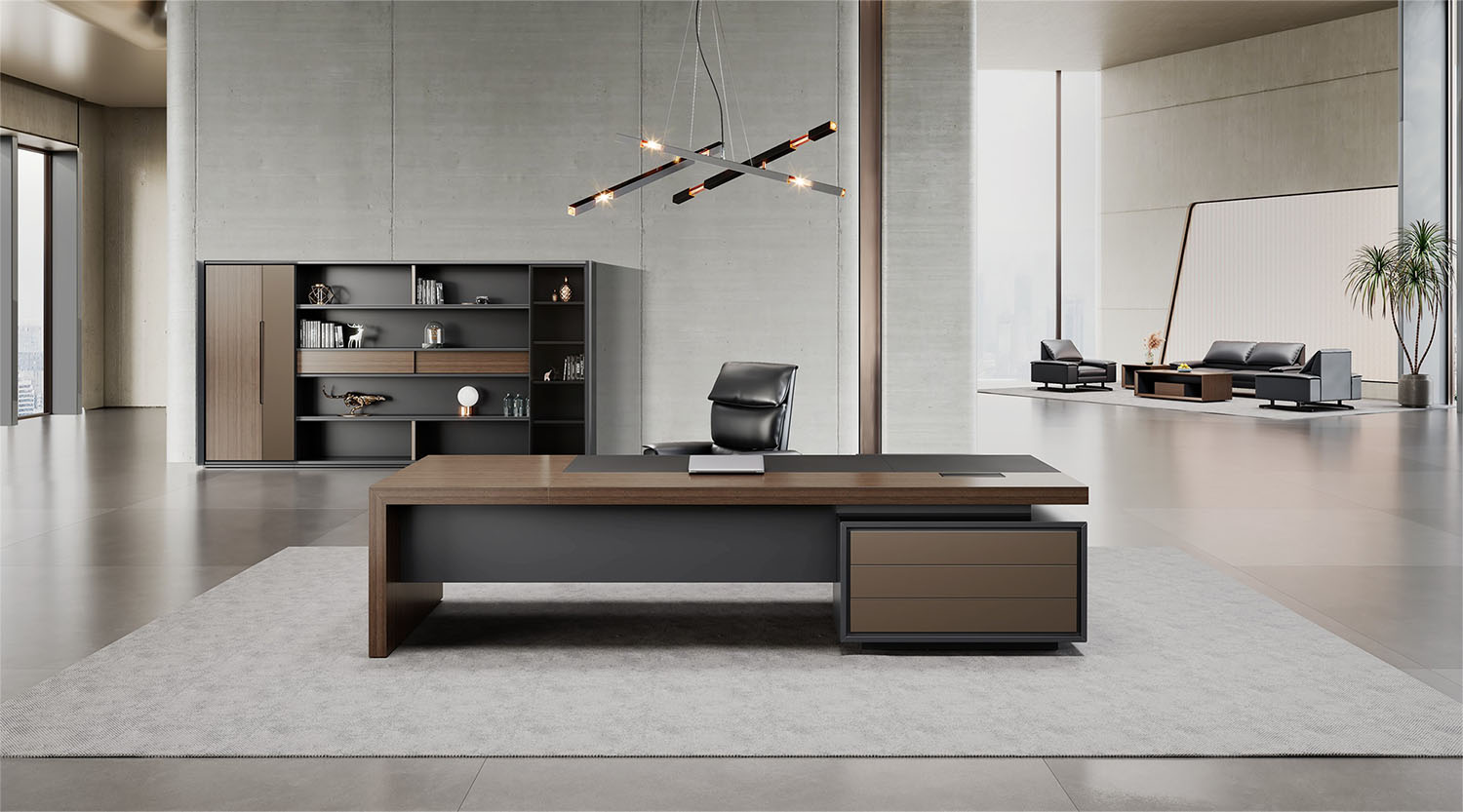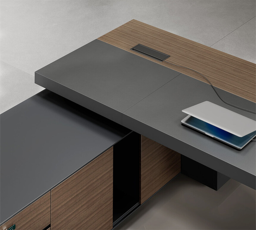 明哲系列辦公家具,采用直紋胡桃和星空灰實色漆元素,高檔實木質(zhì)感飾面,深邃飽滿,紋理清晰,內(nèi)蘊深厚。搭配簡約端正的造型設(shè)計,臺腳的斜切裝置,還有產(chǎn)品的布局變化,錯落有致,承前啟后,展現(xiàn)極致簡潔和視覺效果的完美詮釋。低調(diào)又不失時尚,穩(wěn)重又不失靈動,既營造現(xiàn)代時尚的情緒,還給當今辦公環(huán)境注入明亮、輕松的舒適感。