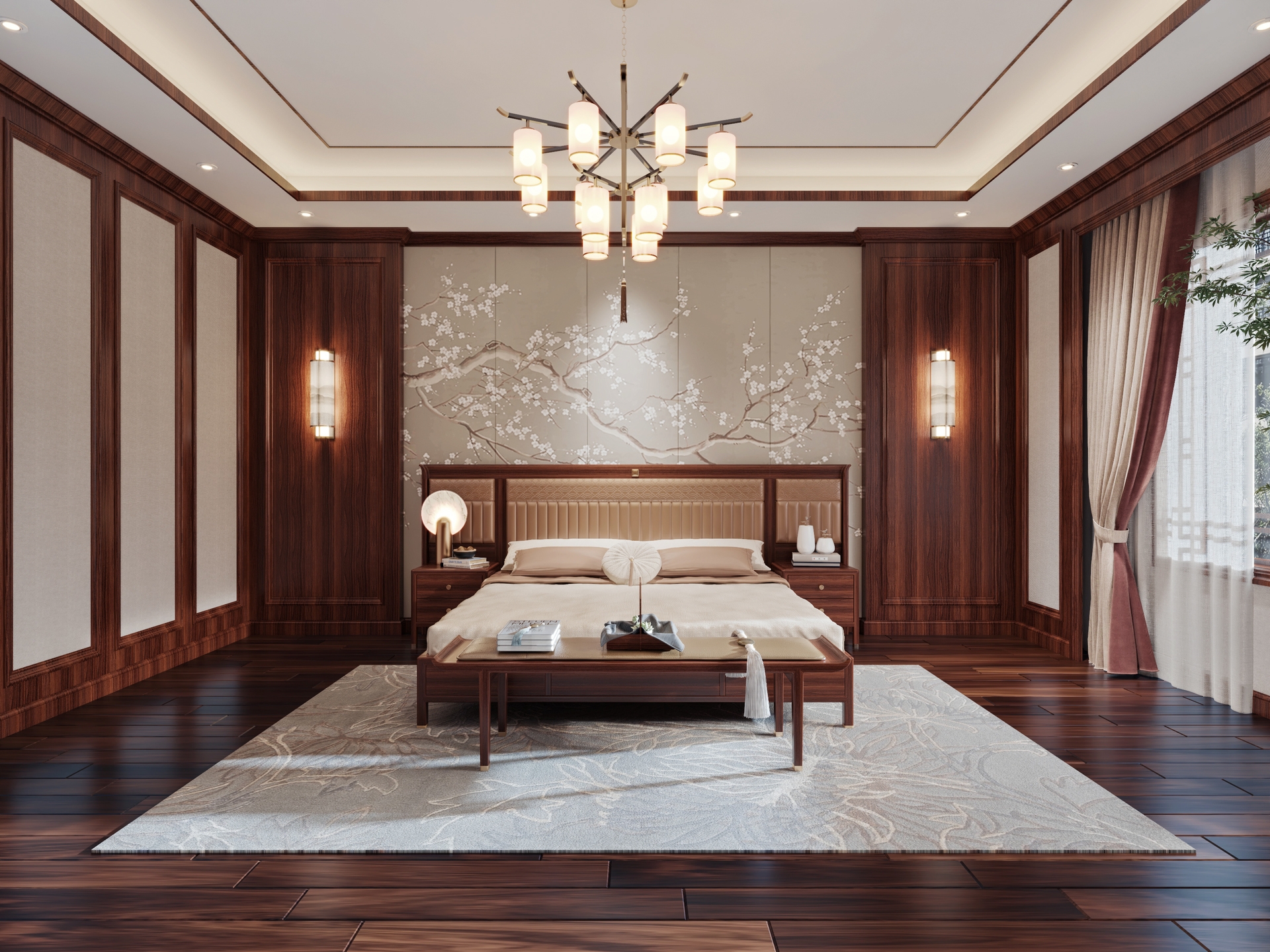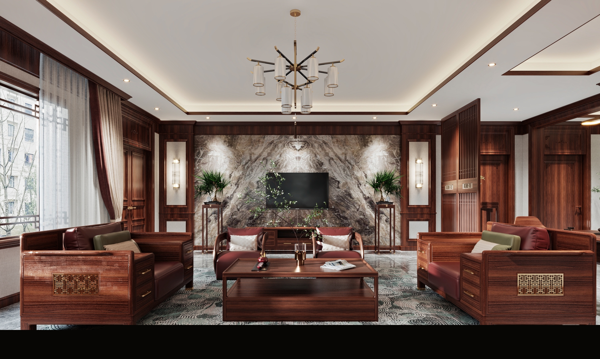 此外,庭院與書房是中式別墅的獨(dú)特空間,傳統(tǒng)的圈椅、博古架、花幾等家具與綠植、假山相得益彰,形成一幅優(yōu)美的生活畫卷。整體而言,新中式家具不僅傳承了傳統(tǒng)文化,還完美契合了現(xiàn)代人的生活需求,使中式別墅煥發(fā)出獨(dú)特的藝術(shù)魅力與生活品質(zhì)。